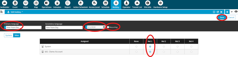 - Assign the holiday to a holiday group by clicking both System and Site options. Typically, Hol 1.