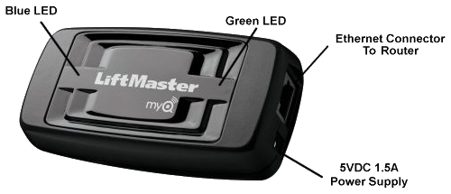 The LiftMaster 828LM Internet Gateway has two LED indicators that show power, internet, and MyQ device status.